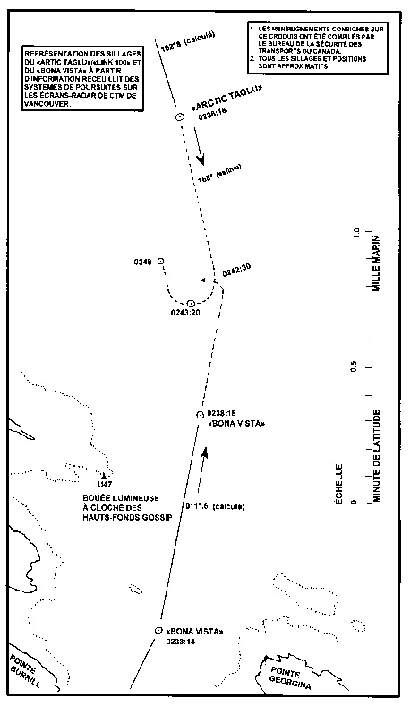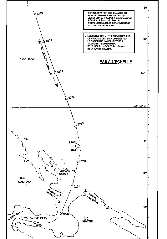 L'ensemble remorqueur-chaland «ARCTIC TAGLU»/«LINK 100», après avoir appareillé du port de Vancouver vers 23 h 15Note de bas de page 3, le 20 juillet 1993, a tout d'abord suivi la route dictée par le dispositif de séparation du trafic alors qu'il se dirigeait vers Active Pass, au sud. La traversée ne comportait pas de difficultés particulières et le pilote automatique était branché. Lorsque l'ensemble remorqueur-chaland s'est trouvé à trois milles environ au nord de la bouée lumineuse des hauts-fonds Gossip, le second, qui était l'officier de quart, a appelé le Centre de trafic maritime (CTM) de Vancouver qui l'a prévenu qu'il y avait des navires contrebordiers sortant d'Active Pass, à savoir deux navires faisant route vers le nord qui approchaient des hauts-fonds Gossip. Le bateau-usine «TYEE NO. 1» était le plus proche, suivi d'un bateau de pêche non identifié qui n'avait apparemment pas de feu de côté vert. Peu après cette communication, le «TYEE NO. 1» a appelé le CTM vers 2 h 30 pour l'avertir que le bateau de pêche non identifié n'avait pas de feu de côté et avait un feu de tête de mât rougeâtre et des feux de proue.