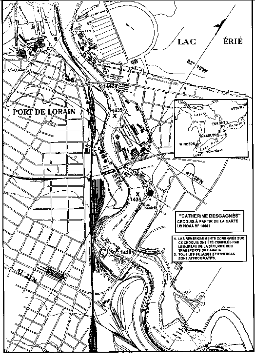 Dans l'après-midi du 6 août 1994, le cargo canadien pour marchandises diverses «CATHERINE DESGAGNÉS» se trouvait dans le port de Lorain, Ohio, aux États-Unis, où il venait d'appareiller sur lest. En tentant de s'immobiliser pour attendre l'ouverture complète de la travée mobile d'un pont routier, le «CATHERINE DESGAGNÉS» est sorti du chenal pour se retrouver dans une marina où il a coulé et endommagé des embarcations de plaisance ainsi que des quais flottants, avant d'aller s'immobiliser contre la berge du côté est du pont. Le «CATHERINE DESGAGNÉS» a endommagé d'autres embarcations de plaisance lorsqu'il a culé pour revenir dans le chenal afin de franchir le pont, qui avait entre-temps été ouvert.