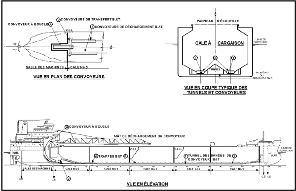 Le «AMBASSADOR» est un vraquier auto-déchargeur dont les emménagements et la salle des machines sont situés à l'arrière. La disposition de base est illustrée dans le plan d'aménagement d'ensemble (annexe A, figure 1). La coque est subdivisée longitudinalement par quatre cloisons étanches transversales: une cloison d'abordage, une cloison à chaque extrémité de l'espace à cargaison et une à l'extrémité arrière de la salle des machines.