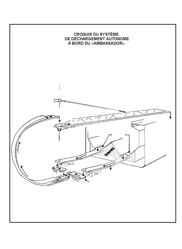 Pour procéder au déchargement, on ouvre des trappes placées au fond des cinq cales dont les parois forment une trémie, et la cargaison se déverse sur deux bandes de convoyeur longitudinales qui l'acheminent jusqu'au convoyeur à boucle situé à l'extrémité arrière de l'espace à cargaison, où elle est hissée jusqu'au mât de déchargement, sur le quai, qui la décharge par-dessus bord. Le secteur où les bandes du convoyeur se déplacent sous les cales à cargaison et l'espace à l'extrémité arrière où se trouve le convoyeur à boucle sont appelés le «tunnel» et le «caisson de la boucle», respectivement. L'équipe de déchargement, sous les ordres du chef mécanicien, se compose du premier officier, du technicien en chef, d'un opérateur et de trois manoeuvres de tunnel. L'opérateur se trouve à la salle de commande, située à l'extrémité avant du pont principal, et surveille la cargaison manutentionnée par le mât de déchargement, tandis que les manoeuvres de tunnel actionnent les trappes des trémies pour régulariser le débit à la demande de l'opérateur et s'assurer que le convoyeur de déchargement fonctionne de façon sûre. La communication se fait au moyen du radiotéléphone (R/T) et d'un système de signaux lumineux. Les officiers supérieurs doivent approuver toute décision de mettre en marche le convoyeur de déchargement ou de l'arrêter.