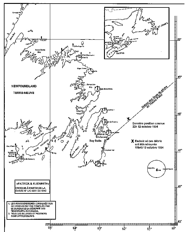 - La perte du «PATRICK & ELIZABETH» avec ses cinq membres d'équipage est survenue, selon les approximations, par 47°40'N et 051°54'W au nord-est de Bay Bulls, entre 22 h le 12 octobre et 17 h 46 le 13 octobre 1994.