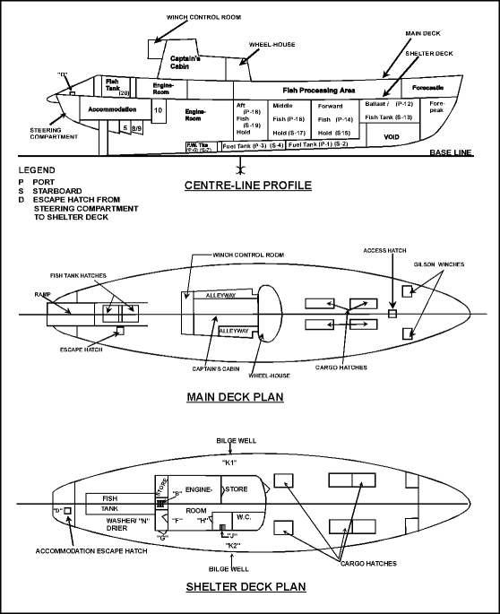 Lorsque le navire a été refondu en chalutier à pêche arrière, les panneaux d'écoutille étanches des cales à poisson d'origine ont été remplacés par des panneaux légers en aluminium non étanches. Bien qu'autorisé par le RIGBP, cela a eu pour effet de détériorer les caractéristiques de stabilité en permettant à l'eau des cales à poisson de couler sur le pont-abri à cause de la forte gîte.