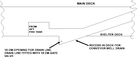 Afin de déplacer le poisson du réservoir à poisson (20) aux convoyeurs de traitement, on avait recours à un système de glissières fermé fonctionnant par circulation d'eau. Le bas de l'ensemble convoyeur se trouve sous le niveau du pont-abri dans un puisard encastré, spécialement construit à cette fin (figure 5). Ce puisard est muni d'un robinet-vanne d'évacuation à la mer (photo 8) de 150 mm afin d'assécher l'ensemble glissière-convoyeur. Il n'y a ni clapet anti-retour ni moyens d'évacuer l'eau qui s'accumule dans ce puisard. L'évacuation à la mer n'assèche pas le pont-abri et elle n'est pas conçue à cette fin.
