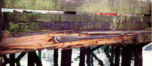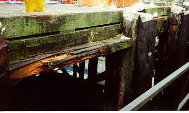 Une des moises du tablier du quai a été brisée. La moise et ses boulons de fixation ont été pliés vers le haut par la force s'exerçant sur eux (photos 6 et 7).