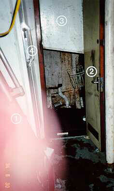 Lorsqu'il parvient au pied de l'échelle (B) conduisant au pont-abri, une grande quantité d'eau s'y déverse. Il réussit à remonter l'échelle jusqu'au pont-abri (photo 4). En prenant pied sur le pont-abri, il constate que celui-ci est recouvert d'environ 1 m d'eau qui se déverse dans les emménagements (G) par la porte ouverte. Il doit lutter contre la pression de l'eau pour ouvrir la porte (F) donnant accès à la salle des machines (photo 5).