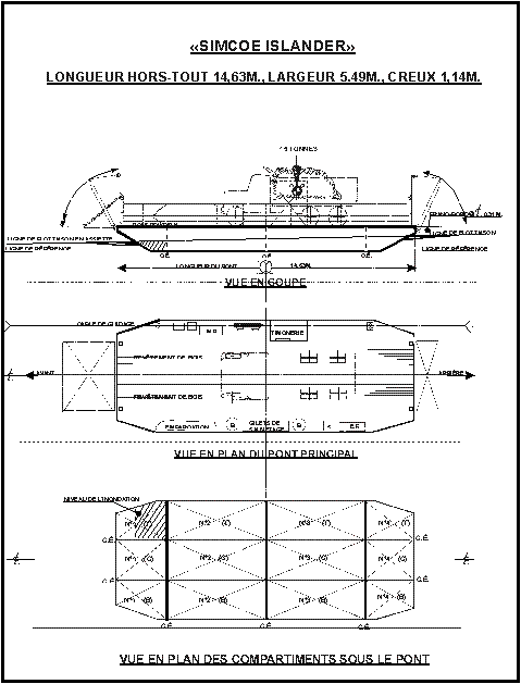 Le «SIMCOE ISLANDER» est un bac à câble autopropulsé tout en acier soudé. Il est muni d'un appareil propulsif hydraulique à moteur diesel, de roues d'entraînement à friction, de chaumards et d'un câble métallique de 19 mm de diamètre; tous ces équipements, de même que la guérite de commande fermée du conducteur, se trouvent du côté tribord du pont principal. La coque est une coque de chaland de forme simple. Ses extrémités sont inclinées de façon symétrique et elle est divisée en 12 compartiments étanches par deux cloisons longitudinales et trois cloisons transversales.