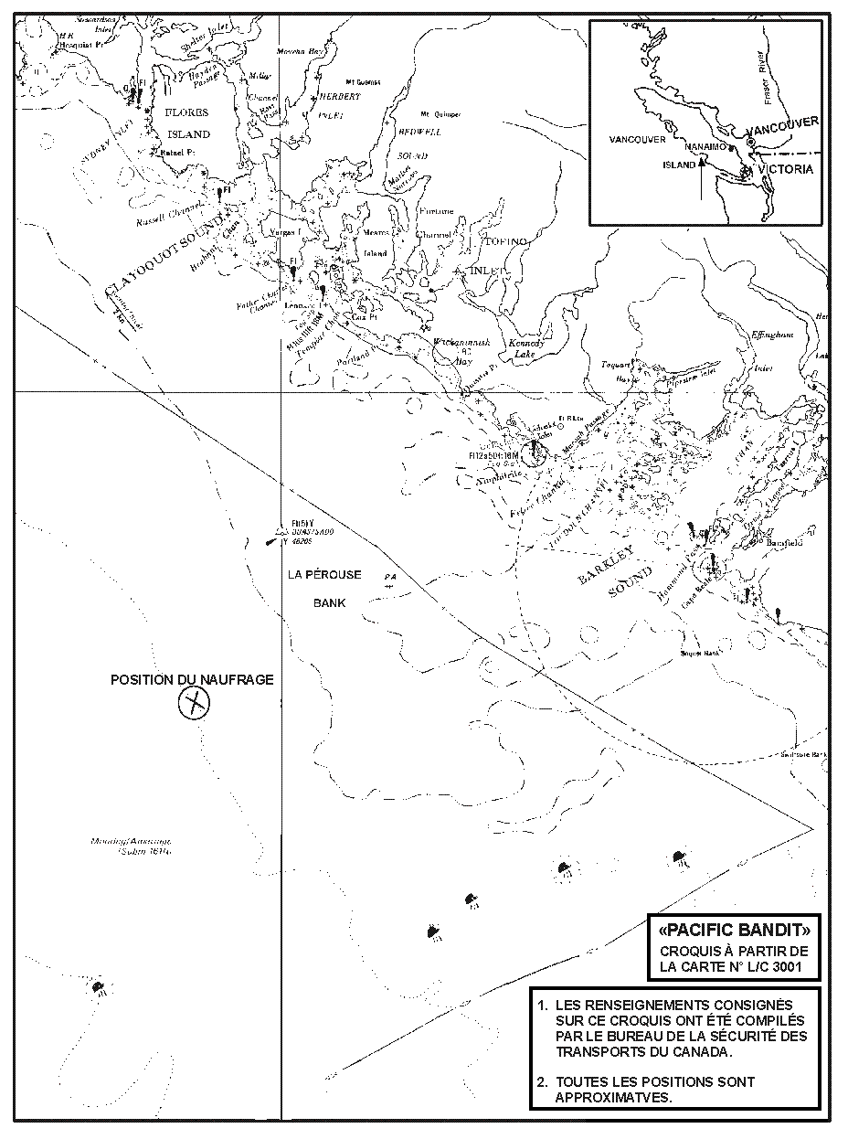 Aux petites heures du matin le 11 février 1995, le «PACIFIC BANDIT», chargé de quelque 23 000 kg de poisson et qui se trouvait au large de la côte ouest de l'île de Vancouver (Colombie-Britannique), n'était pas engagé dans des activités de pêche. Les conditions de mer et de vent étaient telles que le bateau embarquait et retenait de l'eau sur le pont principal. Le bateau a gîté sur tribord et a subi un envahissement par les hauts, après quoi il a chaviré puis coulé. Deux membres de l'équipage ont été projetés par-dessus bord; les deux autres ont abandonné le bâtiment et ont réussi à se hisser à bord du radeau de sauvetage. Trois des membres de l'équipage ont été secourus par la suite, et un naufragé, qui a séjourné dans l'eau alors qu'il ne portait ni gilet de sauvetage ni combinaison d'immersion, a succombé à l'hypothermie et s'est noyé.