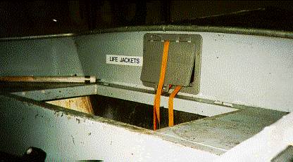 Sur le caisson avant, un écriteau portant les mots «LIFE JACKETS» (Gilets de sauvetage) en lettres de 5 cm.