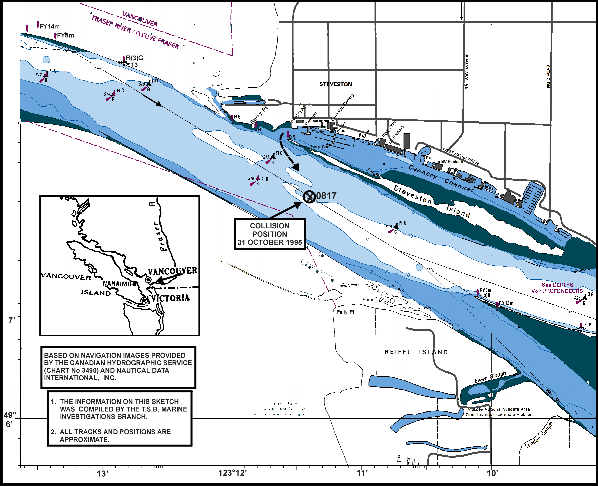 Selon les informations recueillies, le capitaine a augmenté la vitesse quand il a pris la conduite du navire et a fait des changements de vitesse à plusieurs reprises. Au large de l'île Steveston, près des bouées S16-S17, le personnel qui se trouve sur la passerelle de l'ensemble remorqueur-chaland observe deux bateaux de pêche qui pêchent au filet maillant presque au centre du chenal et qui avancent à vitesse réduite en direction sud. L'ensemble remorqueur-chaland se déplace alors dans un secteur où il y a de nombreux bateaux de pêche. Son équipage aperçoit d'abord les deux bateaux sur son avant, mais les perd de vue (avant l'abordage) tandis qu'il s'approche d'eux.