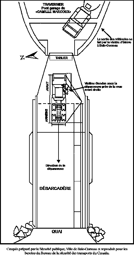 Au moment où la dépanneuse s'engage en marche arrière sur le tablier de l'embarcadère-débarcadère, le chauffeur et le maître d'équipage perdent de vue l'ex-propriétaire et son oncle qui retournent à pied vers l'embarcadère-débarcadère. Le second capitaine demande à l 'ex-propriétaire de se pousser, mais ce dernier continue à marcher au centre du tablier alors que son oncle le suit à quelques pas sur le côté bâbord de la rampe du navire. Le préposé à l'embarcadère-débarcadère, qui observe la dépanneuse faire marche arrière en direction de l'ex-propriétaire, crie et agite les bras pour faire signe à l'ex-propriétaire de se pousser; même le fils de l'ex-propriétaire, qui se trouve en bordure de l'embarcadère-débarcadère, lui fait signe de dégager le passage de la dépanneuse. Toutefois, l'ex-propriétaire ne semble pas se rendre compte que la dépanneuse s'approche de lui.