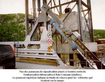 L'embarcadère-débarcadère est muni de feux de signalisation pour contrôler la circulation des véhicules, mais ces feux ne sont pas conçus pour avertir les piétons de la présence d'un danger quelconque. À part les mesures de sécurité qui consistent à faire monter les piétons à bord avant de charger les véhicules et à installer des cordons pour délimiter la partie de l'embarcadère-débarcadère réservée aux piétons, aucun panneau ou avertisseur visuel ou sonore pour signaler les dangers aux piétons n'a été prévu dans le guide d'utilisation. Essentiellement, le seul moyen dont disposent les préposés à l'embarcadère-débarcadère, est d'alerter de vive voix les piétons qui sont menacés d'un danger quelconque. Le préposé et d'autres témoins ont tenté en vain d'utiliser cette méthode au moment de l'accident. En outre, les témoins ont eu moins de temps pour avertir la victime parce que la dépanneuse se déplacait rapidement.