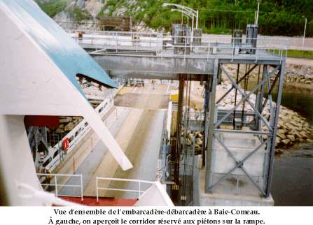 La conception des terminaux est différente dans chaque port. Dans le cas du «CAMILLE MARCOUX», qui transite essentiellement entre les ports de Godbout, Matane et Baie-Comeau, l'accostage se fait de la façon suivante dans ces deux derniers ports :