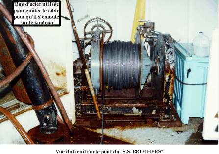 - Pour remonter la drague à pétoncles, un matelot manoeuvrait les commandes du treuil tandis que l'autre guidait l'enroulement du câble sur le tambour.