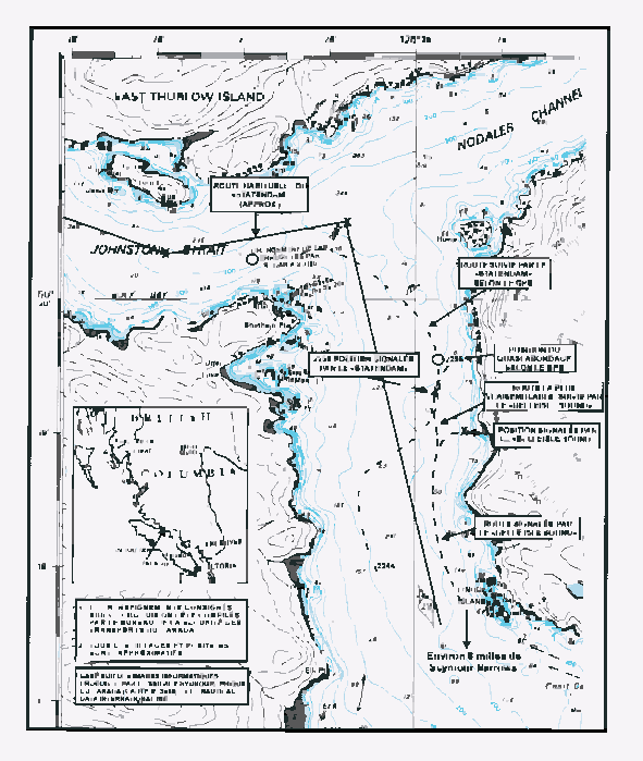 Le « STATENDAM » a continué son abattée sur tribord jusqu'à un cap d'environ 250 V, après quoi il a atteint sa position correcte à peu près au milieu du chenal dans le passage Discovery; la barre a alors été placée à gauche toute et le navire s'est replacé sur la bonne route. Le « STATENDAM » a doublé la pointe Separation à 23 h 12, en route vers Seymour Narrows.
