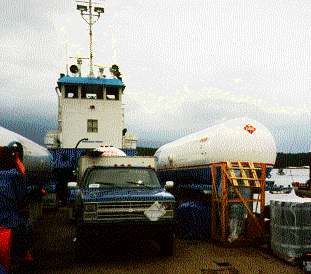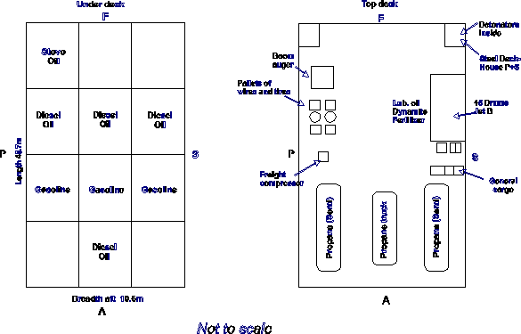 La barge transportait des marchandises diverses destinées à des camps forestiers et à des camps de pêche. En outre, elle transportait les marchandises dangereuses suivantes en pontée : 71 620 litres de propane, 9 225 litres de carburant Jet B, 1 250 kg de dynamite, 3 725 kg d'explosifs à base de nitrate d'ammonium et 10 caisses de détonateurs non électriques. (L'annexe A fournit des renseignements complémentaires sur l'arrimage et la répartition des marchandises, tandis que le paragraphe 1.25 fournit des renseignements sur les classes, la division et les groupes de compatibilité des marchandises dangereuses selon le Code maritime international des marchandises dangereuses (Code IMDG) et le Règlement sur le transport par mer des marchandises dangereuses (RTMMD).)