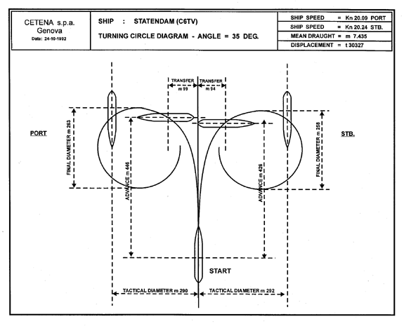 Les données des essais en mer révèlent que si les gouvernails sont placés à droite toute, alors que le navire file 20,24 noeuds, l'avance est de 426 m, le transfert est de 94 m, le diamètre tactique est de 292 m, et le diamètre final est de 258 m. Selon les estimations, il faut au navire 171 secondes et 899 m pour réaliser un arrêt en catastrophe à partir d'une allure de 20,57 noeuds, et 141,4 secondes et 716,8 m à partir d'une allure de 16 noeuds.