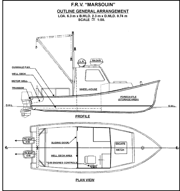 Le « MARSOUIN » est un petit bateau utilisé pour divers projets de recherche en biologie marine réalisés par des scientifiques de l'Institut Maurice-Lamontagne (IML). Le navire est fait de fibre de verre (plastique verre-résine) et comporte un pont du coffre étanche qui va de l'arrière de la timonerie jusqu'à la proue et sous lequel on a injecté de la mousse qui assure une flottabilité permanente.