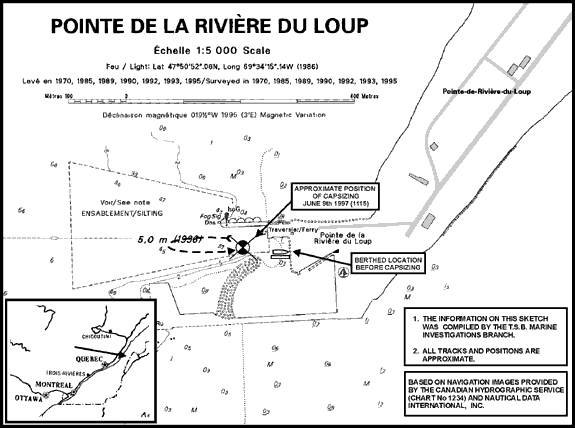 Un mécanicien effectue des réparations au moteur hors-bord de bâbord pendant que le « MARSOUIN » est amarré tribord à quai à un ponton de la marina de Rivière-du-Loup. De temps à autre, la plume de certaines vagues passe par-dessus le tableau, et une pompe de cale électrique placée à l'extrémité arrière du coffre se met en marche par intermittence pour évacuer l'eau ainsi embarquée. Le ponton se trouve dans l'axe de l'entrée de la marina, de sorte que l'arrière du navire est exposé aux lames et aux vents dominants. Le jour de l'accident avant le départ, les vents soufflent généralement du nord-ouest à 10 à 15 noeuds, provoquant la formation de lames qui moutonnent légèrement dans les eaux exposées du Saint-Laurent à l'extérieur de la marina. Dans les zones de plus faible profondeur, près de l'entrée de la marina, la mer est plus courte et plus raide; les lames, d'une hauteur estimée à un mètre environ, s'engouffrent directement dans l'entrée de la marina.