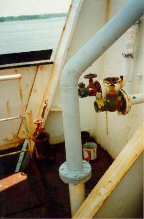 La citerne antiroulis est alimentée en eau de mer par la pompe de service général de la salle des machines. L'eau passe par un clapet de non-retour dans la pompe, puis par un tuyau de 10 cm muni d'un robinet de débit dans la salle des machines. Pour empêcher le remplissage accidentel de la citerne antiroulis, on a posé sur le tuyau de 10 cm un raccord rapide mâle muni d'un bouchon en laiton pesant environ 0,9 kg. Un tuyau flexible de 10 cm raccordait le tuyau de remplissage fixe à l'autre section fixe de la conduite de remplissage qui monte jusqu'au sommet de la paroi avant de la citerne antiroulis et pénètre dans celle-ci.