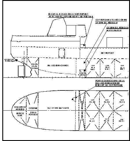 - Le cofferdam arrière, qui communiquait avec l'entrepont et la salle des machines, était utilisé comme citerne à résidus.