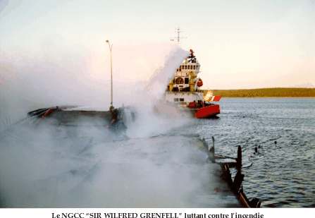 « SIR WILFRED GRENFELL » est arrivé à 9 h 30; son équipage a arrosé le quai avec des canons à eau et a répandu de la mousse jusqu'à ce que l'incendie soit éteint. On a annoncé que l'incendie était éteint vers 11 h le 22 juillet.