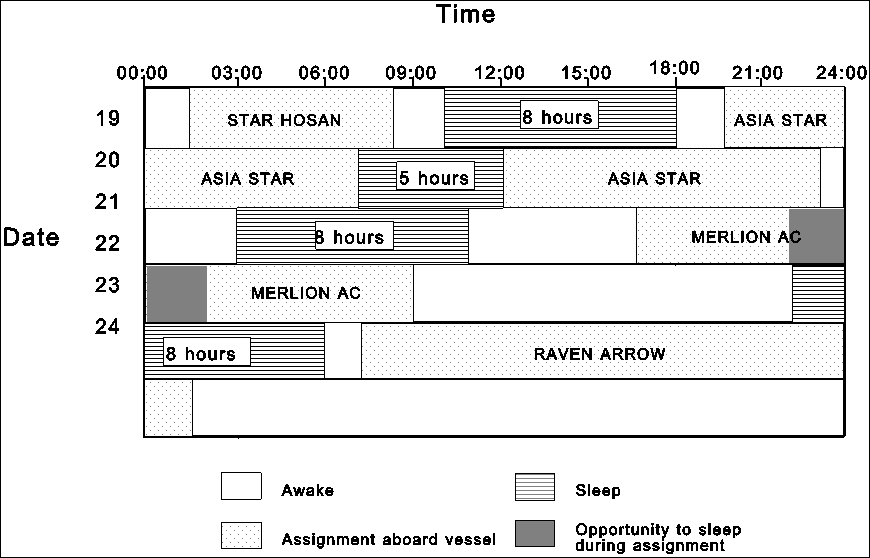 Le fatigue des pilotes n'est pas un problème propre à une région; le problème se pose partout au Canada. Les pilotes sont appelés à travailler selon des horaires irréguliers, parfois exigeants, et à l'occasion dans des conditions météorologiques difficiles. En outre, les zones de pilotage du Canada connaissent des périodes de pointe où la demande de services de pilotage est beaucoup plus forte que la moyenne. En période de pointe, si le nombre de pilotes en service est insuffisant ou si les horaires de travail et de repos sont inadéquats, ou les deux, certains pilotes peuvent éprouver de la fatigue et du stress liés au travail. Le manque de sommeil et la somnolence dues aux périodes de service prolongées ou à des horaires de travail et de repos perturbés ont été retenus comme facteurs contributifs dans une foule d'accidents industriels.Note de bas de page 37 Des études ont montré que les personnes privées de sommeil sont mauvais juges de leur fatigue. Les chercheurs de l'Institut militaire et civil de médecine environnementale ont déterminé qu'on pouvait s'attendre à une détérioration de 30 p. 100 dans l'exécution des tâches cognitives et des tâches qui exigent de la vigilance, après 18 heures sans sommeil, et à une détérioration de 60 p. 100 en moyenne, après 48 heures sans sommeil.Note de bas de page 38