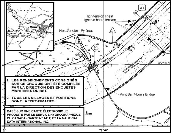 Le navire s'approche du panneau de sifflet « W 9 » en aval du pont Saint-Louis et on peut observer les feux jaunes (du panneau avertisseur) qui clignotent. Ces feux confirment que le pontier a vu le navire et qu'il s'apprête à remonter la travée du pont. Cette dernière commence et continue à monter jusqu'à ce qui semble être sa hauteur maximale. La machine principale du navire est à « en avant toute » et le navire file près de neuf noeuds selon les données du système de positionnement global. Le navire fait face à un contre-courant d'environ deux noeuds.