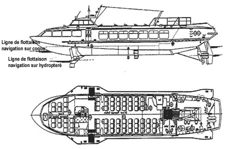 | Tirant d'eau | 2 m sur coque, 1,1 m sur ailes |