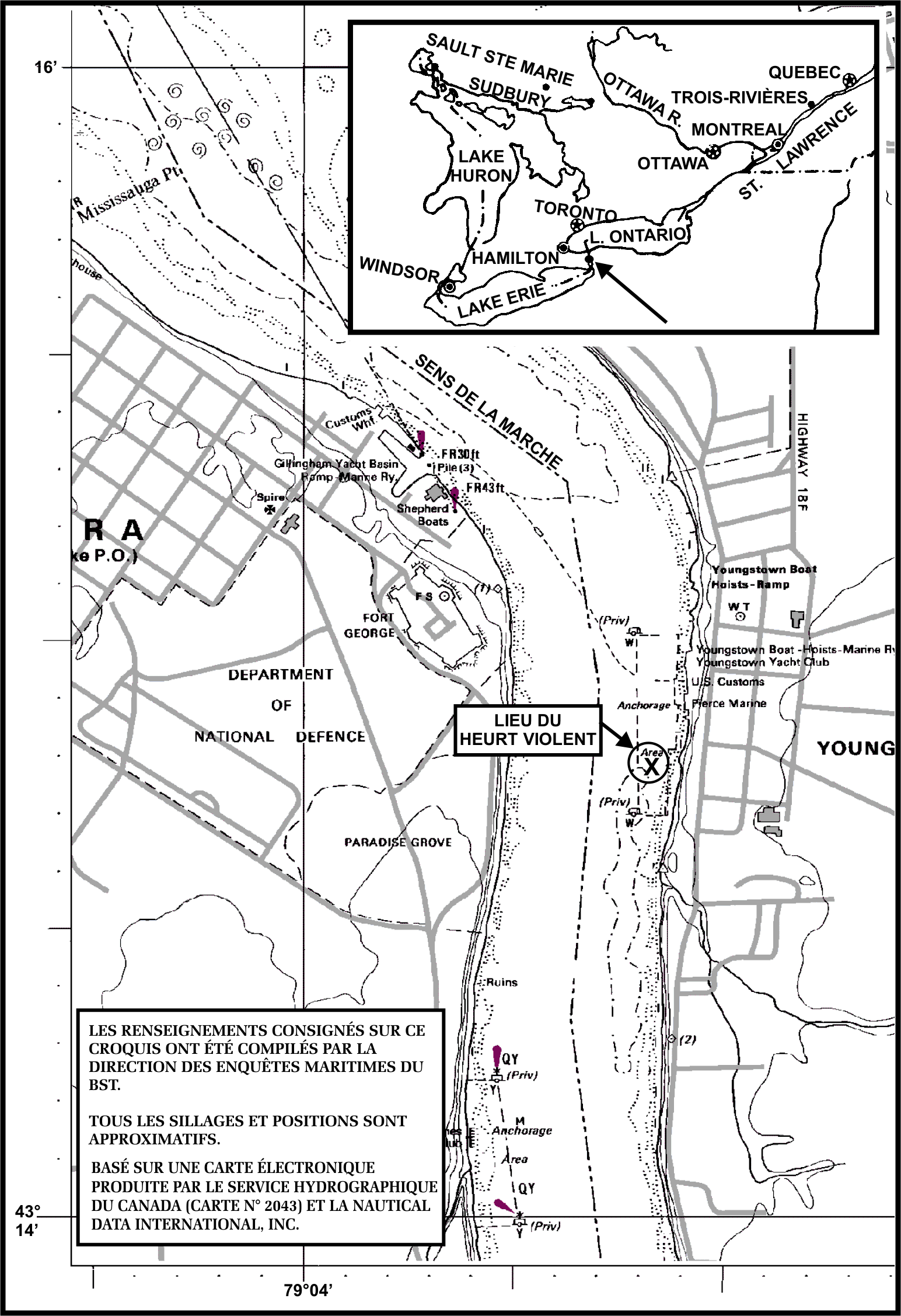 Le 29 août à 18 h, heure avancée de l'Est (HAE), Note de bas de page 2 le Seaflight I quitte Toronto avec huit passagers pour une traversée régulière à destination de Queenston (Ontario). La traversée du lac se déroule sans incident, et l'hydroptère traverse la barre de la Niagara et remonte la rivière du côté américain à une allure de 33 noeuds. À 18 h 58, alors que l'hydroptère se trouve à 60 m au large de la zone de mouillage du yacht-club de Youngstown, le safran se déplace de façon intempestive vers la gauche. Le capitaine, qui assure la conduite de l'hydroptère, engage la pompe auxiliaire, puis le système de commande auxiliaire de gouvernail. Le second place les machines en arrière toute et actionne la corne pour signaler le danger; cependant, on n'entend que trois coups de corne avant que le Seaflight I pénètre dans la zone de mouillage selon un angle d'environ 45 degrés.