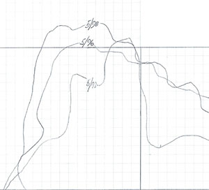 Les changements subséquents d'allure en manoeuvre ont contribué à faire avancer davantage le navire sur la crête. Pendant que le niveau d'eau baissait, le poids de la coque sur la crête aurait fait des éraflures sur le bordé. Les éraflures entre 30 m et 75 m de la proue confirment les distances de 30 m et 40 m signalées par le second capitaine.