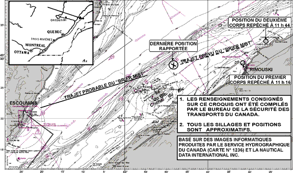 On présume que le bateau a coulé à environ 4,5 M au nord-est de l'île du Bic et à environ 10 M de Rimouski. Les deux jours consacrés aux recherches sous-marines n'ont pas permis de retrouver l'épave du « BRIER MIST ». Avant le naufrage, le capitaine n'a pas indiqué s'il y avait des avaries à la coque ou à la structure du bateau.