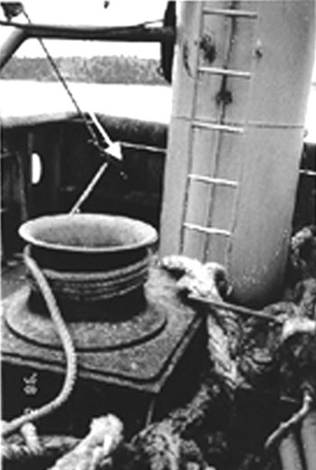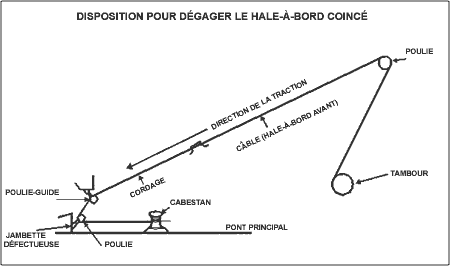 Afin de libérer le câble coincé, un cordage a été frappé à l'extrémité du hale-à-bord avant de le passer dans une poulie-guide placée au sommet de la potence de bâbord, puis, vers le bas, dans une poulie de type yo-yo ayant une limite de charge de cinq tonnes; on l'a enfin attaché au pavois arrière et finalement frappé sur un cabestan placé du côté bâbord du pont arrière. Le capitaine a averti tous les matelots de se tenir loin des câbles et du cordage sous tension qui traversaient le pont de travail sur toute sa longueur.