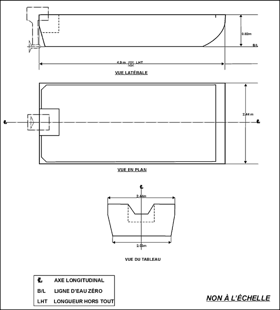 Il s'agit d'une petite embarcation à fond plat non pontée en aluminium. L'avant et l'arrière ont la même forme. L'embarcation n'a ni double fond ni emménagements ni bancs pour les occupants. Elle est propulsée par un hors-bord de 60 HP commandé et gouverné d'un endroit situé du côté tribord à l'avant. On peut voir un schéma de l'embarcation à l'annexe A.