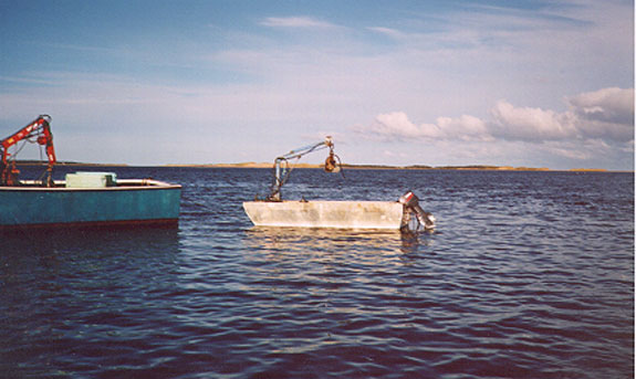 Le patron et son assistant récoltent une pleine charge de boudins remplis de moules. L'embarcation n'est pas assez large pour placer côte à côte deux rangées de bacs, et le patron a l'habitude de placer trois bacs l'un derrière l'autre sur l'axe longitudinal; au fond de l'embarcation, il place l'équivalent de deux bacs et demi de moules dans leurs boudins. Chargée de la sorte, l'embarcation a un franc-bord d'environ 30 cm, ce qui correspond aux conditions normales d'exploitationNote de bas de page 5.