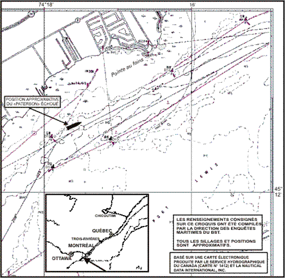 Le matin du 5 avril 1999, le « PATERSON » naviguait vers l'aval sur le lac Saint- François, à une vitesse de 11,5 noeuds. Il transportait une cargaison de 28 312 tonnes de maïs à destination de Sorel (Québec). La visibilité était bonne et la lumière du petit jour était faible. Tous les systèmes fonctionnaient normalement et l'OQ, qui se chargeait aussi des fonctions de pilotage depuis que le navire avait quitté l'écluse de Snell, naviguait à l'aide de repères visuels, du système de cartes éélectroniques (avec communication DGPS Starlink), du radar et du gyrocompas. Les relevés de position n'étaient pas reportés sur la carte. L'erreur du gyrocompas était minimale, à plus ou moins 0.5 degré. Un timonier était affecté au poste de gouverne et exécutait les commandements à la barre.