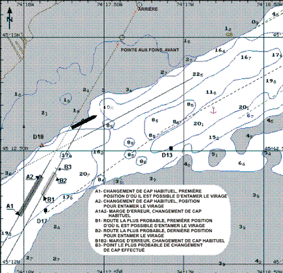 - La navigation a fait appel seulement aux techniques de manoeuvre à vue et à l'utilisation d'un système de cartes éélectroniques, et n'a pas utilisé les techniques de pilotage aux instruments, dont la détermination radar des distances de giration.