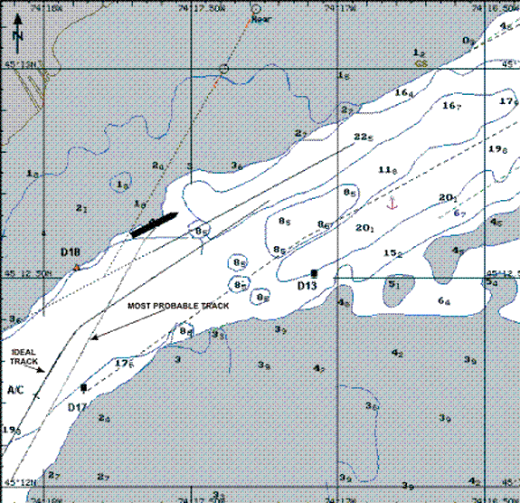 En raison du coude que fait la rivière à Pointe aux Foins, l'espace de manoeuvre est plus grand qu'à d'autres endroits entre Saint-Lambert et le lac Ontario. Ironiquement, un nombre disproportionné d'échouements similaires se sont produits dans ce coude, comparativement à d'autres tronçons situés plus à l'ouest, en direction du lac Ontario. L'examen des accidents révèle que, dans bien des cas, on s'en était trop souvent remis aux seules techniques de manoeuvre à vue. Les marins se sont peut-être laissé induire en erreur par le faux sentiment de sécurité attribuable à l'espace de manoeuvre accru dont ils disposaient à cet endroit. Ce faisant, ils ont négligé de recourir à des pratiques de navigation sûres comme les techniques de pilotage aux instruments et, en particulier, la détermination au radar des distances de giration.