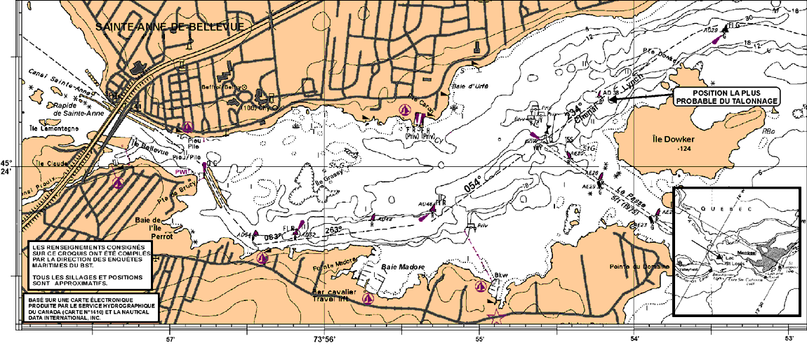 Au moment de l'incident, la GCC n'a pas encore fini de mettre en place les bouées qui servent à marquer le chenal des petites embarcations pendant l'été à cet endroit. De la bouée « Lachine A » à la bouée AD-18 inclusivement, toutes les bouées sont en place. Les autres bouées, à partir de Sainte-Anne-de-Bellevue en montant, ne sont pas encore en place.