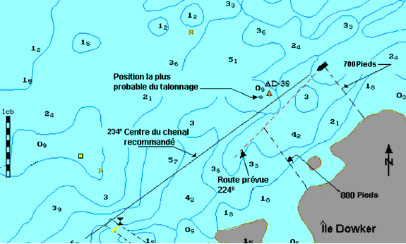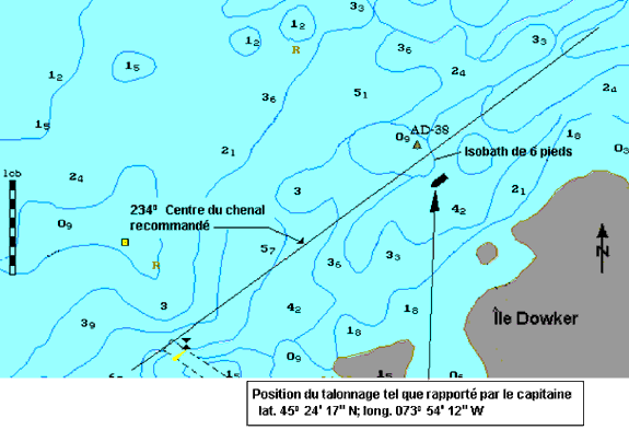 La ligne bathymétrique à 1,83 m (6 pi) de profondeur ci-dessus mentionnée se trouve à peine à 30 m (100 pi) au nord-ouest de la position « approximative » donnée par le capitaine. Le seul sondage individuel qui a été fait sur cette ligne bathymétrique indique une profondeur de 0,91 m (3 pi) à 61 m (200 pi) au nord-ouest du centre du chenal recommandé. On ne connaît pas précisément toutes les profondeurs qui prévalent ailleurs sur la ligne bathymétrique mais on sait que le fond est à moins de 1,83 m (6 pi) au-dessus du zéro des cartes. On sait qu'au moment de l'incident le « CANADIAN EMPRESS » avait un tirant d'eau arrière de 1,6 m (5 pi 3 po) et que les radiateurs de cale faisaient saillie d'environ 0,05 m (2 po) sur la coque.