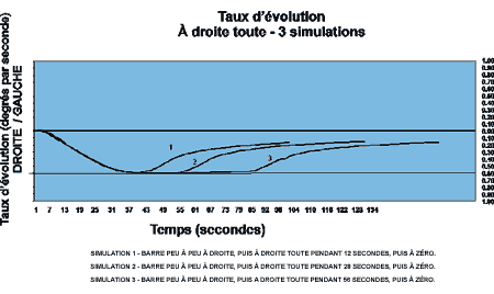 | 1437:50 | Barre mise 10° (ou 15°) à droite | Indicateur d'angle de barre se déplace vers la droite normalement | Pas de changement de cap | |