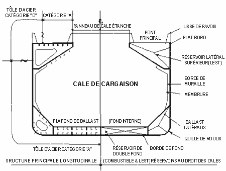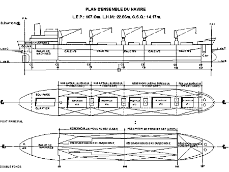 L'annexe C (Plan d'ensemble) montre l'emplacement des cinq cales à cargaison, des ballasts et des soutes à mazout. La cale no 3 pouvait aussi servir de citerne de ballast pour le lest. La coque comptait sept cloisons étanches transversales, ainsi qu'un plafond de ballast de double-fond étanche qui s'étendait d'un bout à l'autre du navire sous les cales à cargaison et la salle des machines. Au droit des cales à cargaison, le pont principal, les ballasts latéraux supérieurs, le plafond de double-fond et le bordé de fond étaient supportés par une charpente du système longitudinal. Le bordé de muraille simple s'appuyait sur une charpente du système transversal au droit des cales à cargaison et des ballasts latéraux supérieurs.