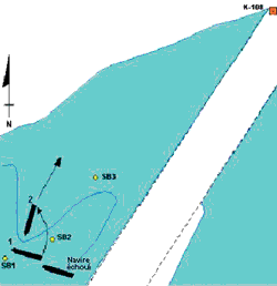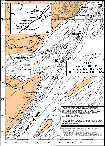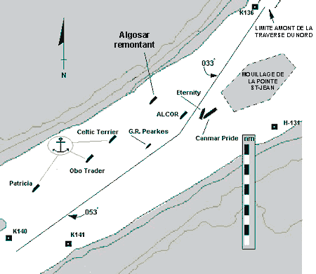 Vers 14 h 15, le Alcor pénètre dans les eaux plus resserrées de la Traverse du Nord près du cap Gribane. Alors que le navire est sur l'alignement lumineux au 213½° vrai (V), le pilote se rend compte que le répétiteur du compas gyroscopique indique bel et bien 1° de moins, comme il soupçonnait. Au point de changement de route suivant, au cap Brûlé, sur l'alignement lumineux au 204°V, le pilote donne l'ordre de suivre une route au 201° gyro (G) afin de compenser l'écart de 1° du répétiteur et l'influence du courant montant qui porte vers le sud-ouest. En arrivant près de la bouée K-108, le navire se trouve à une soixantaine de mètres à tribord du centre du chenal et il file 14 noeuds. Le courant de 2,5 à 3,5 noeuds porte au 215°V. La bouée K-108 constitue le prochain point de changement de route et le navire doit y venir sur tribord pour se placer sur l'alignement lumineux suivant, lui aussi au 213½°V. Le seul autre bâtiment dans les parages est un navire descendant qui se trouve à une distance comprise entre 1½ et 2 milles marins (nm) droit devant (voir le croquis des lieux à la figure 4).