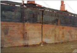 La citerne à trémie no 2 de tribord et la citerne à trémie no 3 de bâbord qui étaient utilisées comme citernes de ballast ont été perforées lors du premier échouement. Par la suite, la coque a subi d'autres avaries importantes (B 1.3, Rupture de la coque).