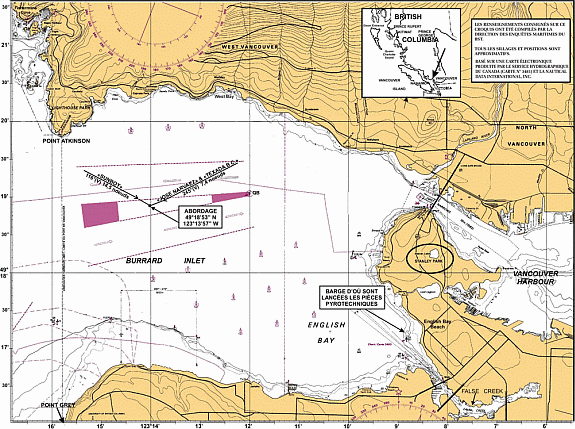 Le Sunboy, une embarcation de plaisance immatriculée aux États-Unis, arrive dans les eaux canadiennes dans la soirée du 3 août 1999. Le conducteur trouve un lieu d'amarrage temporaire sur le front de mer devant les terrains de l'hôtel Bayshore près des quais charbonniers, dans l'arrière-port du port de Vancouver. À bord se trouvent le conducteur-propriétaire, sa femme et leurs deux enfants. Le lendemain soir, la famille se sert de l'embarcation pour aller assister à des feux d'artifice au sud du pont Lions Gate, dans une section de l'avant-port de Vancouver connue sous le nom de English Bay. Les pièces pyrotechniques sont tirées d'une barge mouillée dans English Bay à proximité de la plage. Deux jours plus tard, le 6 août, le conducteur trouve un nouveau lieu d'amarrage pour le Sunboy à la marina Thunderbird située dans l'anse Fisherman à Vancouver ouest, la municipalité voisine.