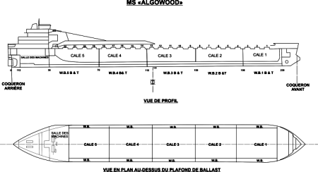 Le Algowood est un vraquier auto-déchargeur construit en acier comptant cinq cales à marchandises. Les machines de propulsion, l'appareil à gouverner, la timonerie, l'équipement de sauvetage et les emménagements se trouvent dans la partie arrière du navire. L'emplacement des cales à marchandises et des citernes de ballast (W.B.) est illustré à la figure 1. La coque est divisée par des cloisons étanches transversales : une cloison d'abordage, une cloison à l'arrière de l'espace de chargement et une cloison à l'extrémité arrière de la salle des machines.