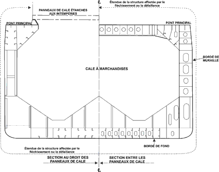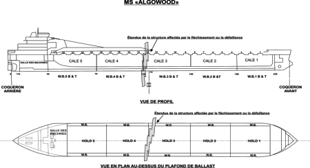 La structure de la coque du Algowood a subi une défaillance majeure soudaine. Les figures 3 et 4, ainsi que les photos 1, 2 et 3 montrent l'emplacement, la nature et l'étendue de la défaillance. L'examen des avaries, fait pendant que le navire était amarré à Bruce Mines, a révélé un fléchissement et une distorsion étendus sur le pont (figure 4) et sur le bordé extérieur B et T, au-dessus de la flottaison, ainsi qu'un fléchissement localisé et une rupture par traction du bordé de muraille et des côtés inclinésNote de bas de page 6 des citernes de ballast B et T.