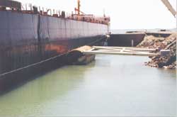 Les enquêteurs ont examiné l'hypothèse que le navire ait pu être affecté par des distorsions et des fractures ponctuelles dues à des obstacles au fond de l'eau, près du poste à quai. Le dernier levé hydrographique effectué dans le secteur remonte à septembre 1997. Le 10 juillet 2000, des plongeurs ont fait un levé ponctuel afin d'évaluer la profondeur et l'état du fond. Le levé n'a révélé la présence d'aucun obstacle non indiqué sur les cartes, ni de rochers ou d'autres accidents du terrain susceptibles de causer des avaries au bordé de fond ou initier la défaillance de la coque. De plus, l'examen des dossiers de chargement de la compagnie minière avant juin 2000 a révélé que des navires chargés à ce poste à quai avaient au moment du départ un tirant d'eau supérieur à celui du Algowood, et qu'ils n'avaient pas subi d'avaries consécutives à leur chargement.