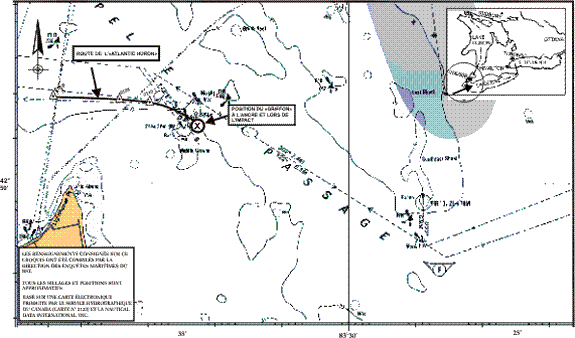 Le poste de mouillage du « GRIFFON » se trouvait à quatre encablures de la trajectoire recommandée qui est imprimée sur la carte, et le navire n'a pas émis un appel SÉCURITÉ.Note de bas de page 11 De plus, ni le navire ni le centre de SCTM n'ont diffusé un NOTSHIP pour aviser les navires de passage de la présence du « GRIFFON ». Par conséquent, l'« ATLANTIC HURON » et le « LADY SANDALS » n'ont pas disposé de l'information nécessaire à la sécurité des navires qui naviguaient dans le secteur.