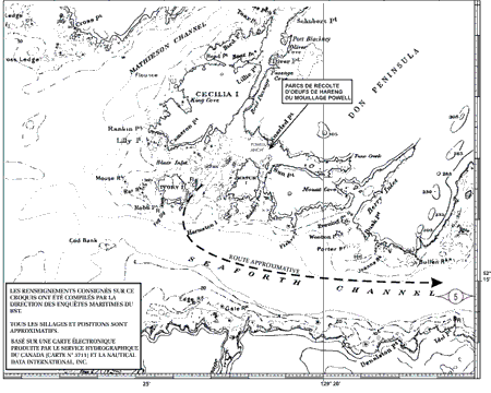 Vers 20 h, le bateau quitte le mouillage Powell. Afin de neutraliser le roulis après être entré dans le passage Seaforth, le patron ordonne d'abaisser les paravanes.