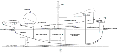 La cale à poisson est divisée en trois parties. Comme le poisson est souvent transporté dans un mélange de glace et d'eau, les compartiments sont aussi appelés «citernes à poisson». La cale à poisson s'étend à l'arrière, coiffée par le pont supérieur sur lequel un tambour (pour enrouler les filets) est monté à l'arrière. À l'arrière de la superstructure, un panneau, entouré d'une hiloire, donne accès à trois compartiments étanches : les cales à poisson avant de bâbord et de tribord (de part et d'autre de l'axe longitudinal) et la cale à poisson arrière. Le panneau est flanqué de deux petits écoutillons à plat-pont et derrière, un petit écoutillon encastré donne sur la cambuse (voir Figure 1, Aménagement typique).